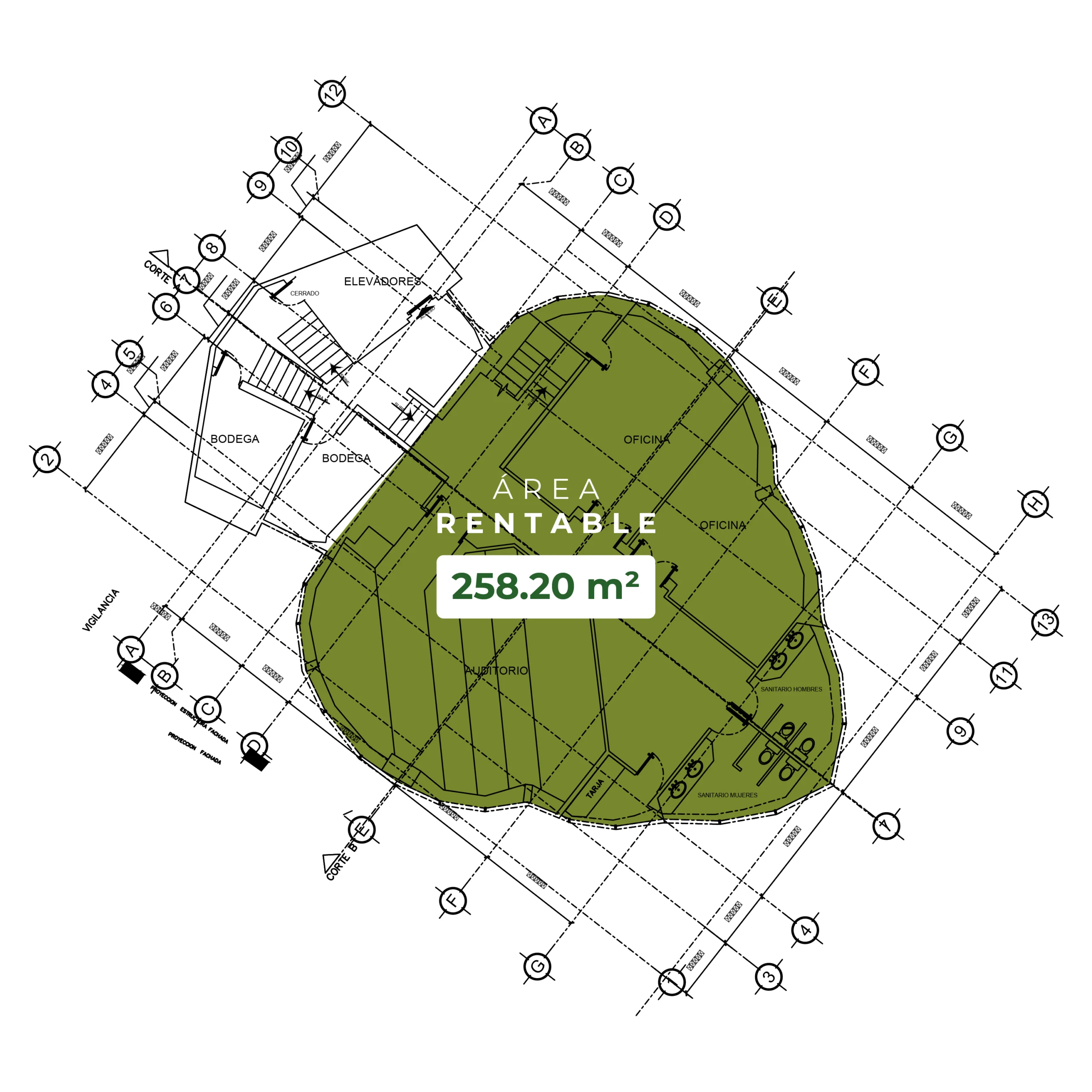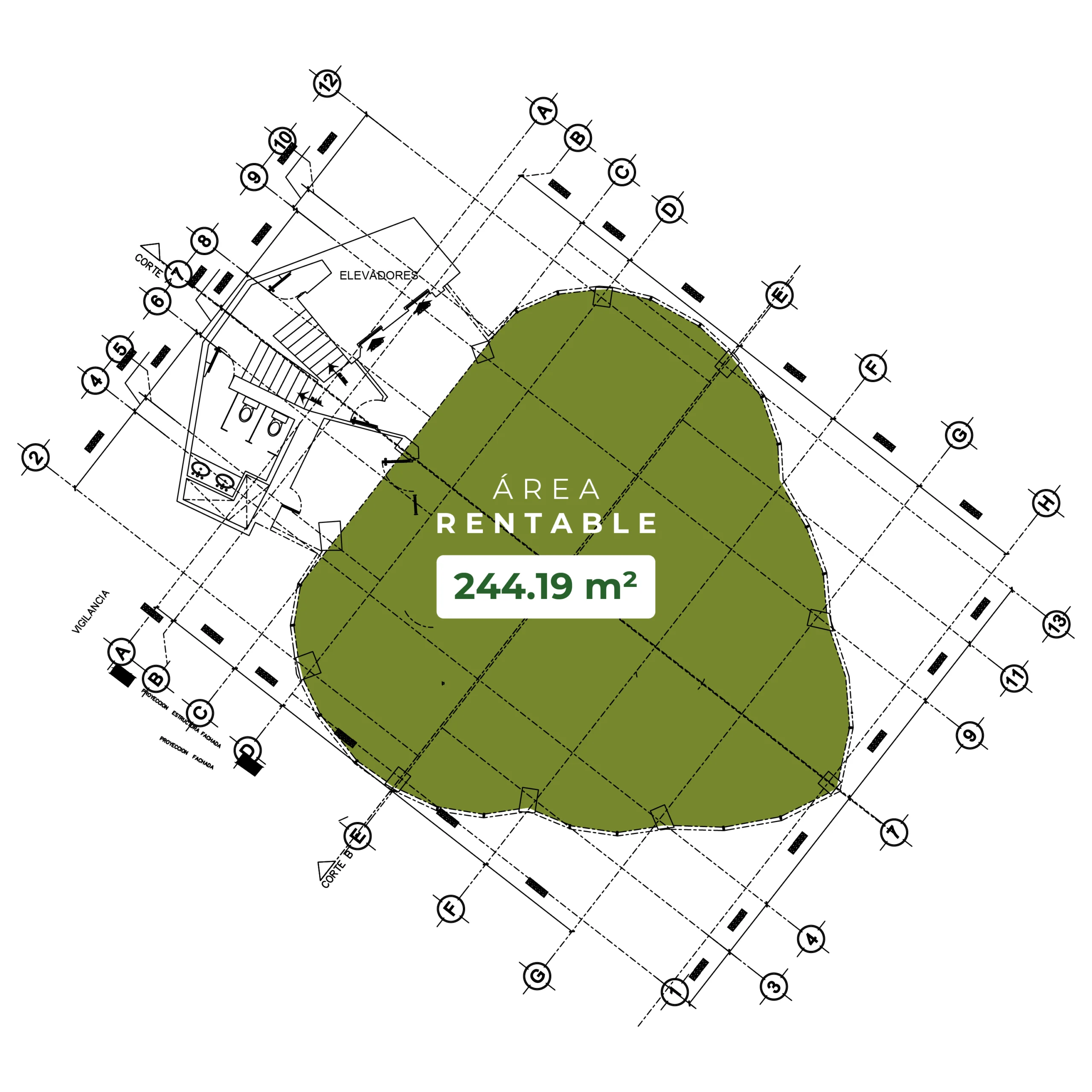 Planta disponible en nivel superior con 228.43 m² de área útil y 42.13 m² de áreas comunes, sumando 270.56 m² de superficie rentable. Ideal para oficinas, showrooms o proyectos corporativos que requieran una ubicación exclusiva y espacios amplios y luminosos.