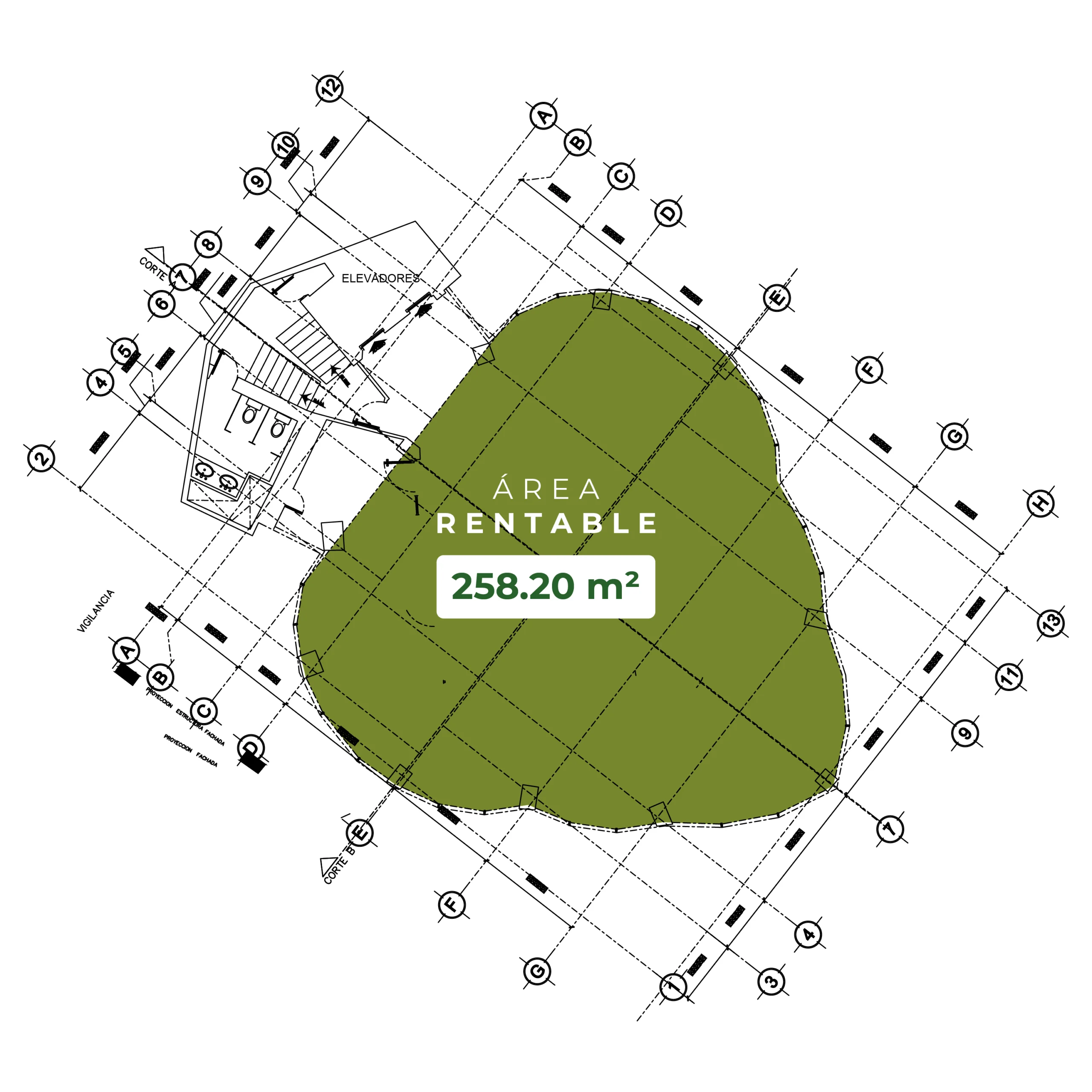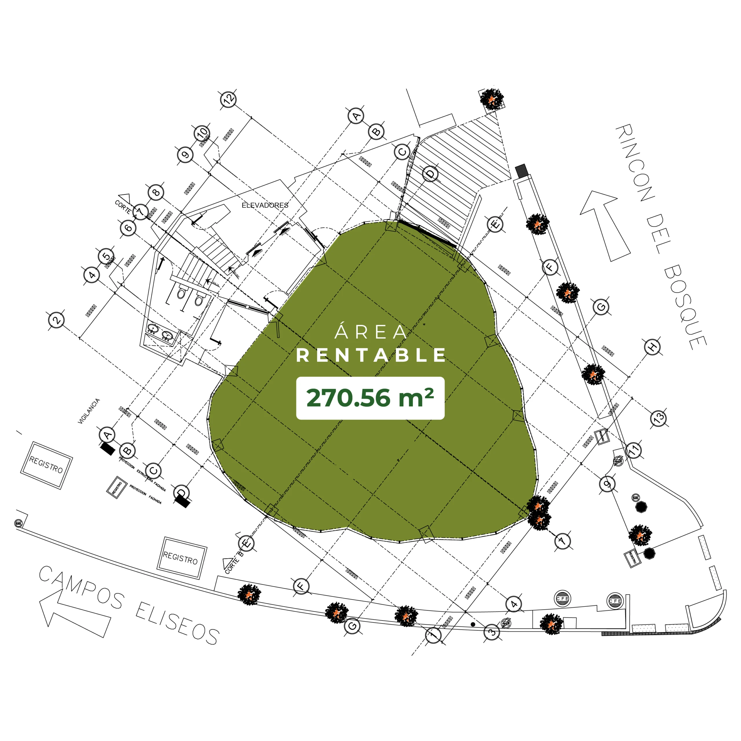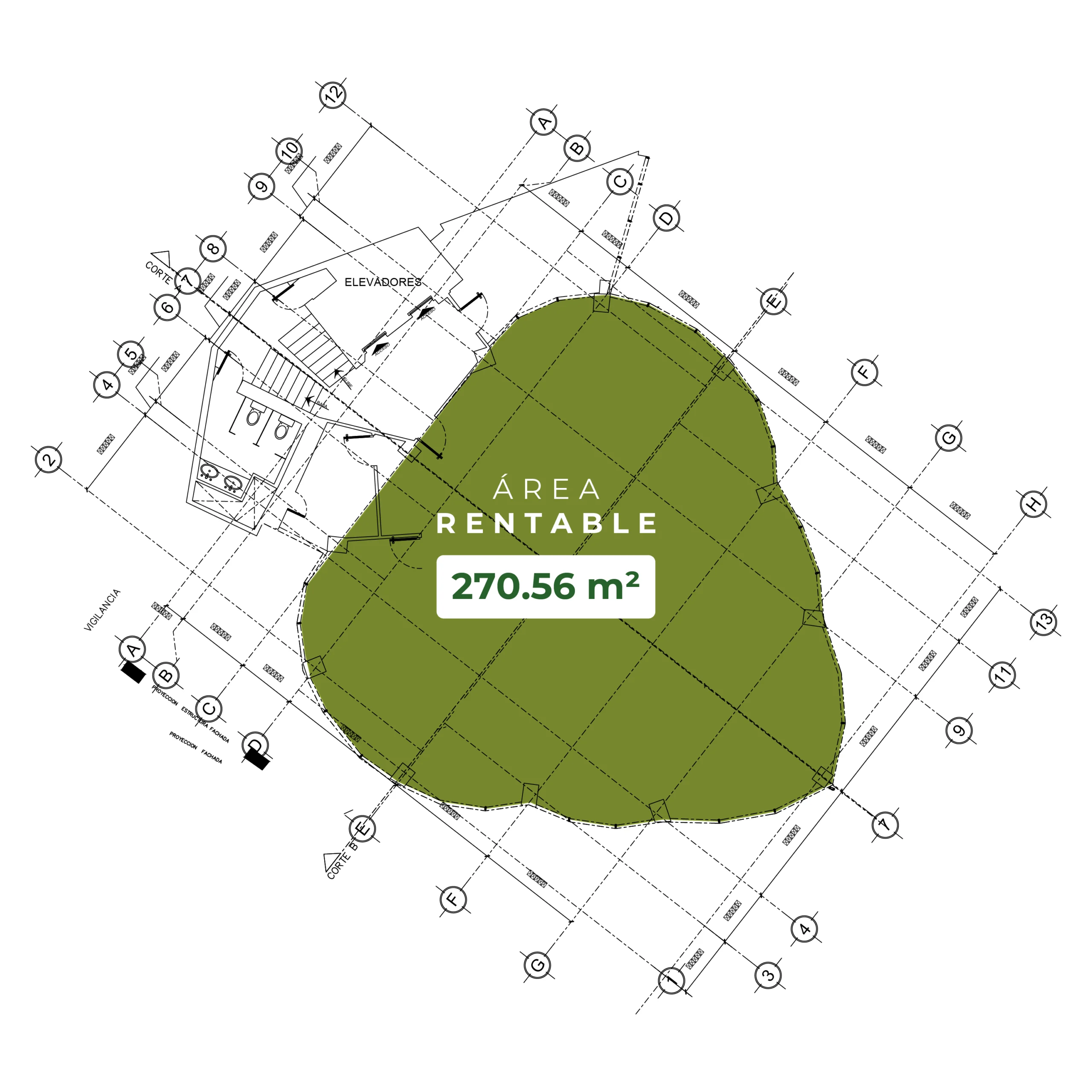 Espacio en nivel alto con un total de 270.56 m² rentables. Distribuidos en 228.43 m² de área útil y 42.13 m² de áreas comunes. Ideal para empresas que buscan privacidad, vistas elevadas y un entorno profesional con excelente conectividad.